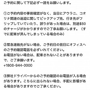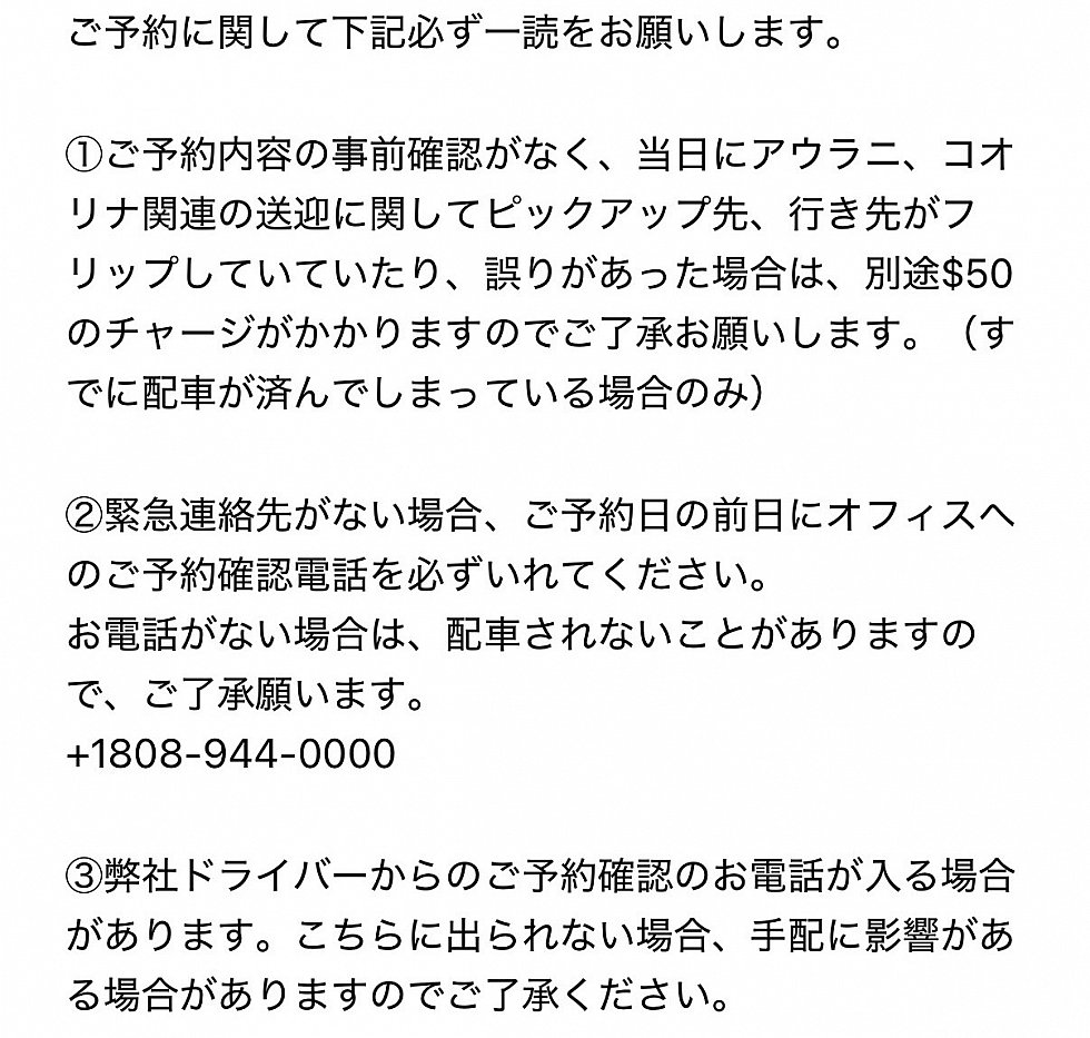その中にはホテルの部屋番号がわかったら連絡すること、緊急連絡先がない場合予約確認の電話が必要であること、ドライバーから電話が来る可能性があることが記されていました。