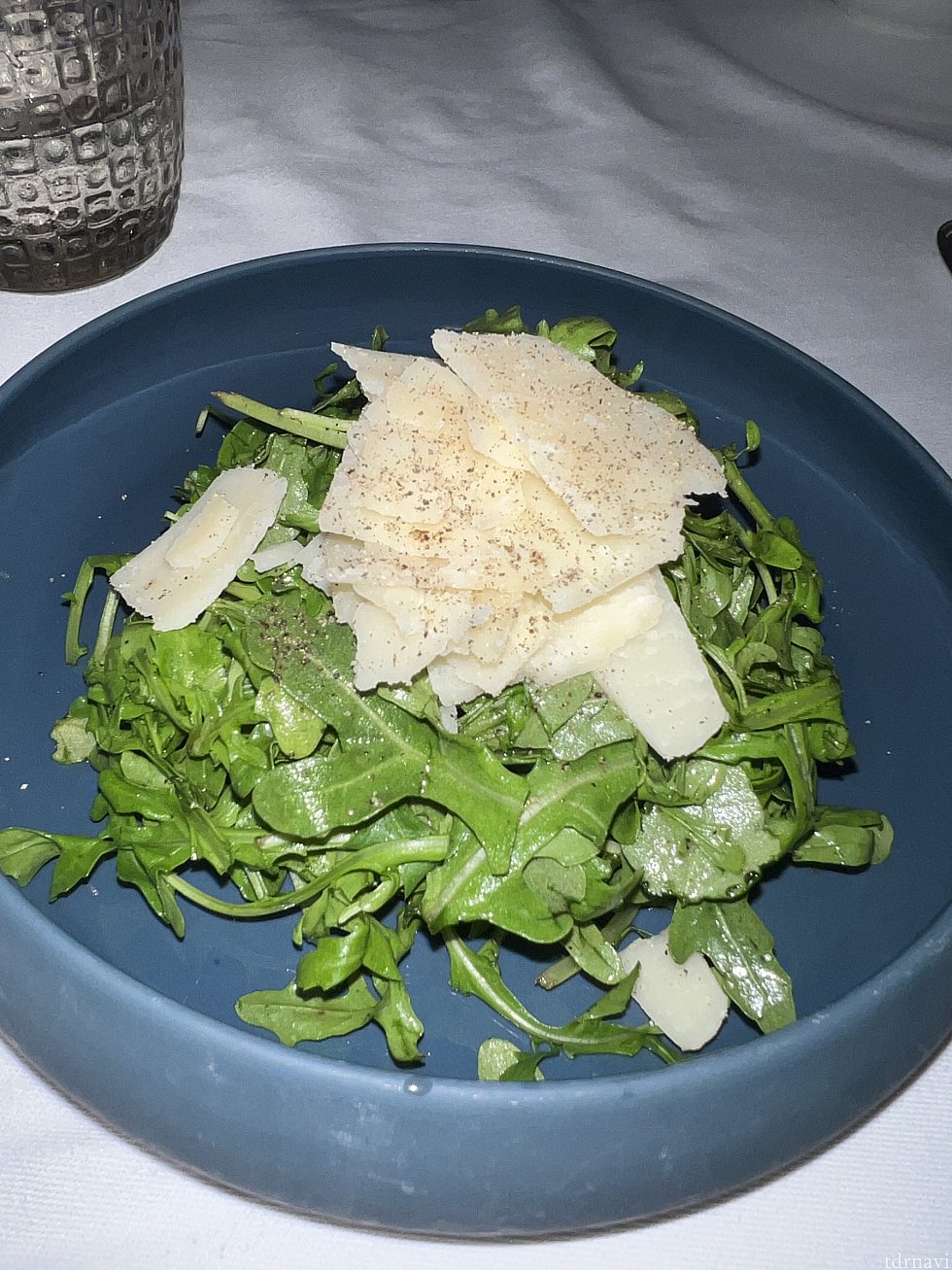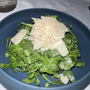 ルッコラとオリーブオイル、ホワイトバルサミコにパルミジャーノレッジャーノチーズが乗っています。