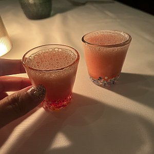 我々はノンアルにしたところ、ショットグラスでピンク色のドリンクがきました。