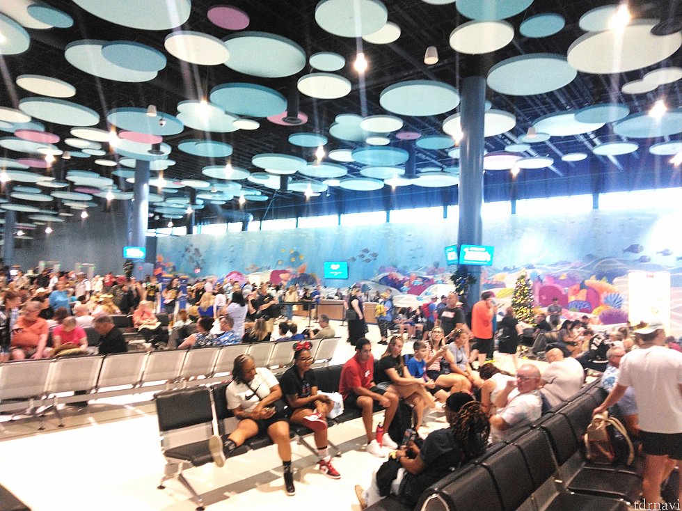Uber降車場すぐ前にバゲージドロップがあり、スーツケースとはお別れ。先に進むと、アライバルタイムごとに列が形成されおり、私の11:45が入場を始めたところでした。