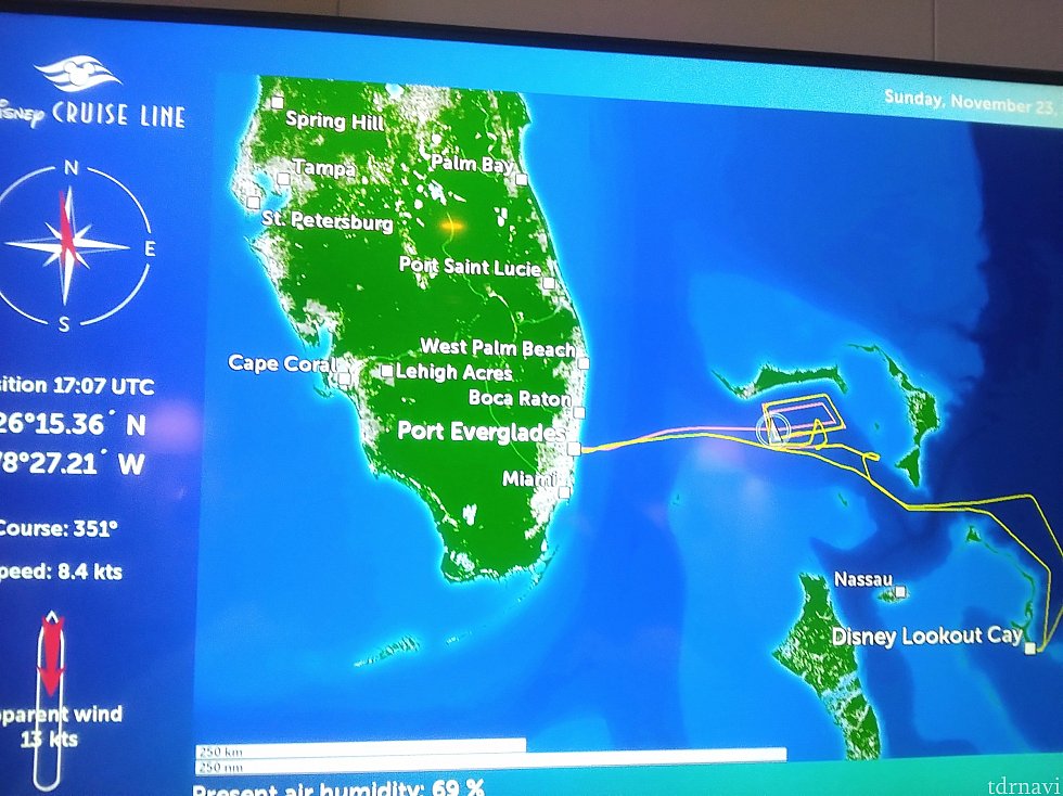 2日目はライトハウス・ポイント、3日目はキャスタウェイに寄港。4日目は洋上日ですが、グランド・バハマ島沖を2周?してました。