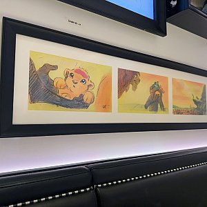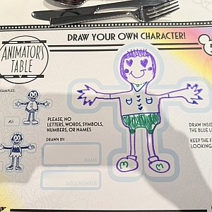 ここは、食事の終盤に自分たちの描いたキャラクターが動く演出をみることができるのですが、料理を注文する前にその絵を描き終えてサーバーさんに渡さなければなりません。私のめっちゃくちゃ下手くそな絵が邪魔で申し訳ありませんが薄い水色の枠からはみ出ないようにかかないとそこから出た分はアニメーションに反映されません。一部この薄枠が輪郭になると勘違いして目や口だけが浮いてるものもあったので、水色の枠の中で自分で体や顔の輪郭も描いた方がいいです!ペンは3本ほど机においてありますのでそれを使ってください。