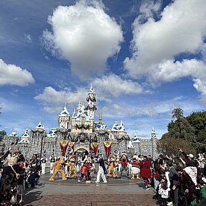 そんな中で、「キャッスル前でディズニーランドバンドと共にディズニーキャラクターが登場します!」とのアナウンスが流れたので、急きょ参加することにしました!