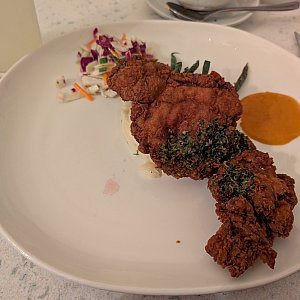 チキンポットパイとブルーベリーのグラタンアイス乗せはほぼ完食できましたが、メインの巨大フライドチキンがどうしても口に合わず、ごめんなさい残しました。