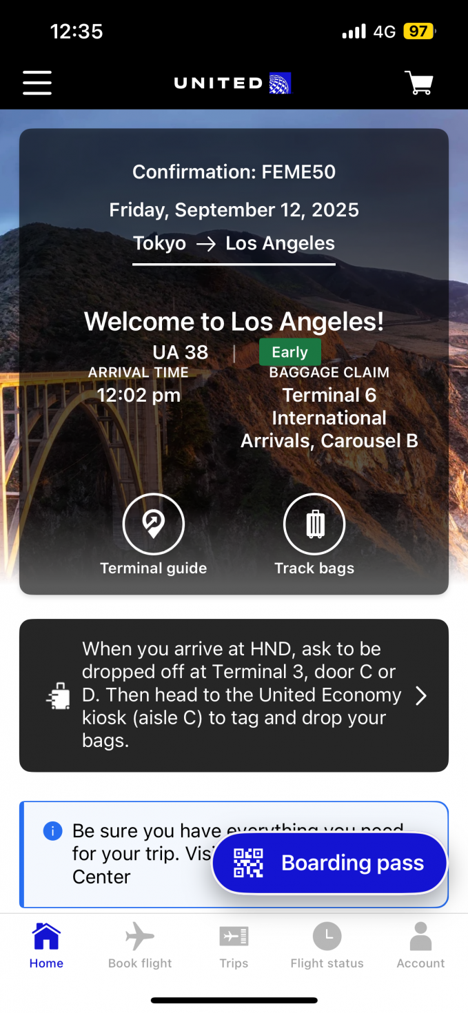 仕事を半休にして夕方出発で選んだところ、18:25発→12:45LA着でユナイテッドが一番お得で時間も丁度良かったので選択しました。帰りも10:45LA発だったので、朝早過ぎないのも良かったです。