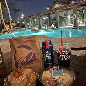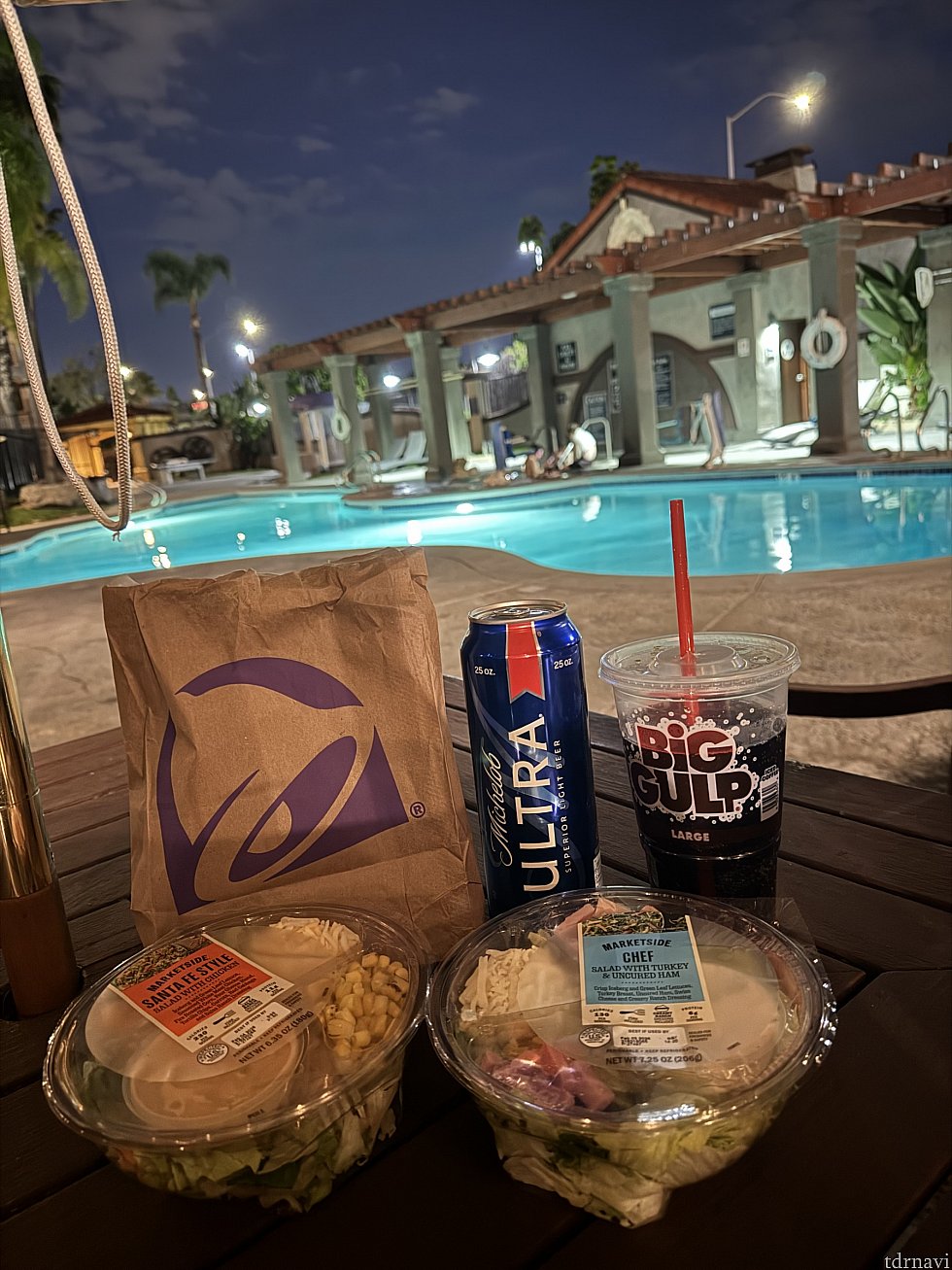 雰囲気がよく誰もいなかったのと、イスとテーブルがたくさんあったので着いた日の夜ご飯はスーパーで買ってプールサイドで食べました。