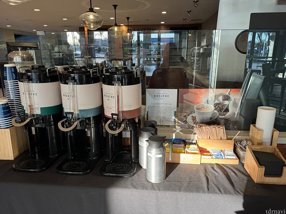 朝食を付けていなくても、朝フロント前に無料のコーヒーと紅茶があります。パークに向かう途中に飲むために毎朝もらっていました。