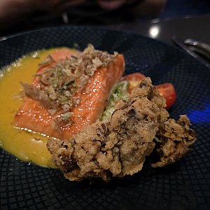 味噌ソースのサーモンとマッシュルームの天ぷらです。