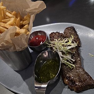 ニューヨークストリップステーキとポテト。ステーキソースはペッパーコーンソースとチミチュリ(ハーブ系のソース)のどちらかを選べます。※チミチュリを選びましたがハーブが得意でなければペッパーコーンの方がよいかもしれません