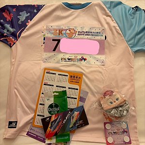 内容はTシャツ、ゼッケン、ゼッケンの固定具、キャラクタのシュシュ(5Kはジュディ、3Kはリーナベル)、A5サイズのカレンダー(下敷き)、スポンサーのスケッチャーズの割引券、ウェットタオル、FiJIFilmのチラシ(走っている間に撮影した写真の購入等)