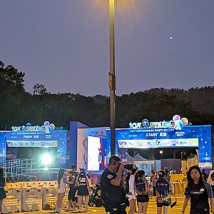 それが終わると一斉にスタート地点へ。右側に狭いステージがあり、VIPの簡単な挨拶のあと、キャラクタも登場して、紙吹雪のなか、スタートです。