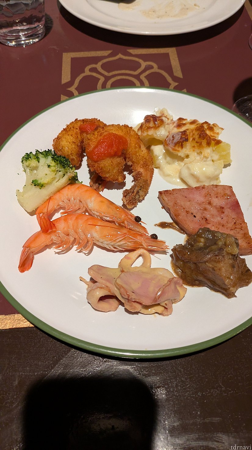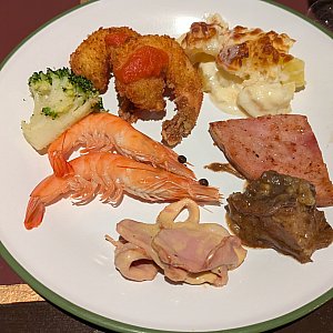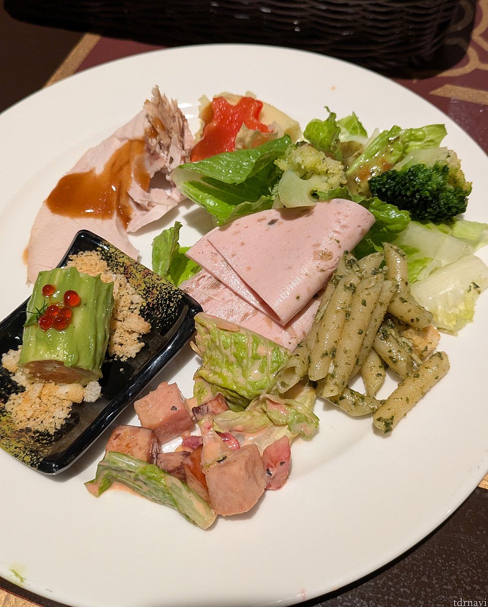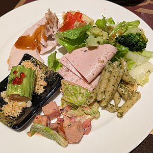 ビュッフェ台には前菜、お肉や魚のメイン料理、デザートまで色々な種類のお料理があり、頻繁に補充されていました。大きなローストチキンを切り分けてもらいました!