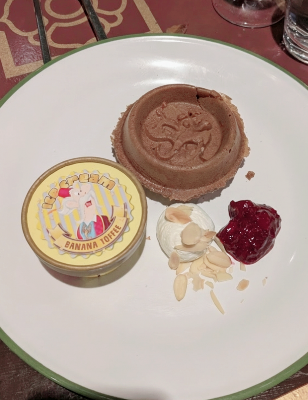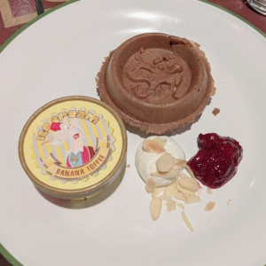 ミスティック卿やアルバートの顔のチョコレート風味のワッフルに、バナナ味のアイスクリームとクリームやソースが添えられています。