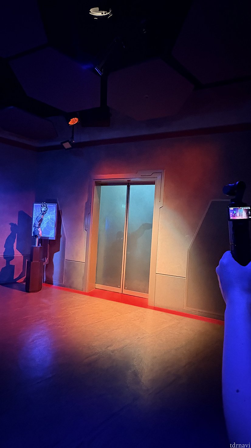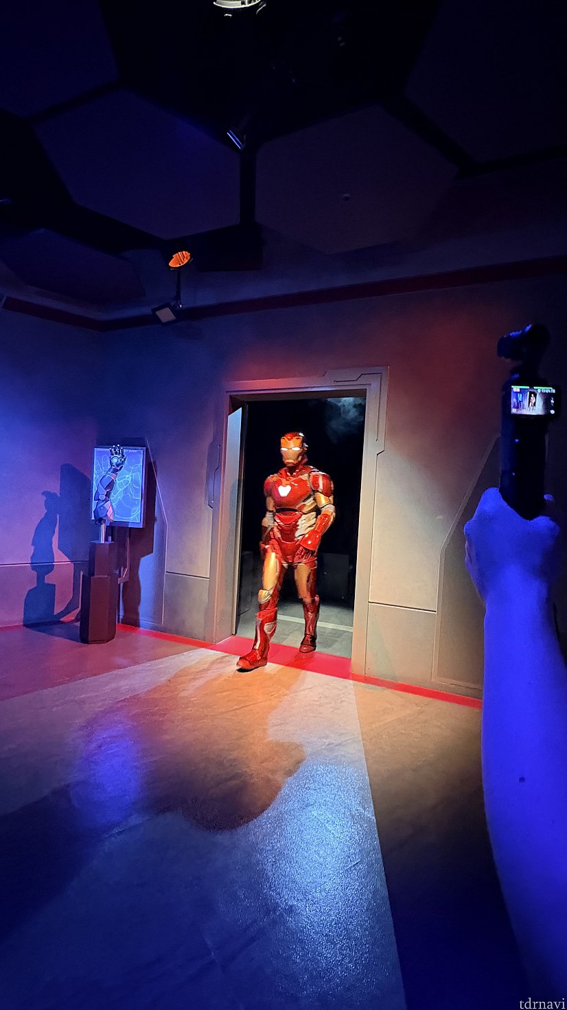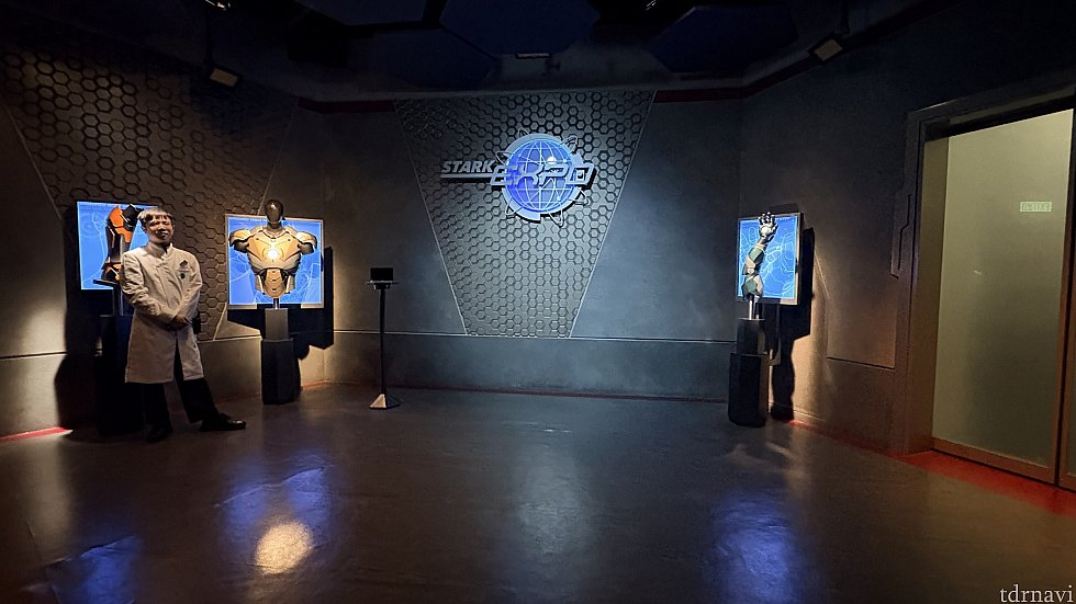 並んでいる間はただ待つだけ…ではなく、ちょっとした演出(プレショー) があるのが面白いポイント!参加者みんなでセキュリティチェックを受けるような雰囲気の空間に通され、まるで スターク・インダストリーズの一員になったかのような ワクワク感が高まります。