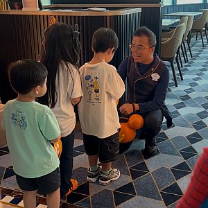 受付を済ませると、紙製のハロウィーンバケツ(お菓子を入れる用)を受け取ります。それを持ってロビー周辺の各所を回り、キャストさんに「トリック・オア・トリート!」と声をかけるとお菓子をもらえる、という楽しい内容です。