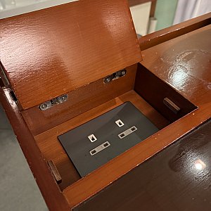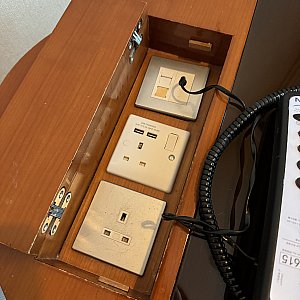 電源はデスク電話の横にタイプAのUSBが2つとコンセント、冷蔵庫の上にコンセントが2つ、どちらもBFタイプなので差し口の変換器が必要です。