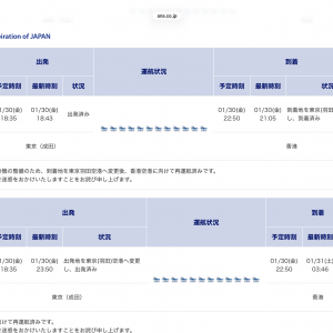 今回乗ったのはANAの成田発香港行き。当初の時刻はこちら。