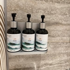 使い勝手の良いハンドシャワー(可動式)で、水圧は普通。シャンプー等は固定式のボトルが備え付けられています。【総評】