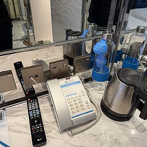 デスクの奥にあるボトル(タンブラー的なもの)は有料の販売品です。無料の水ではないので注意してください。