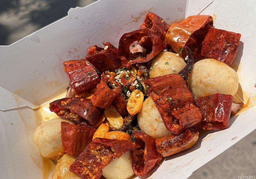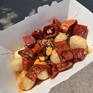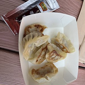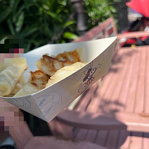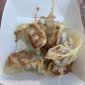 直訳すると「イカと魚のグリル、四川胡椒のボール、ピーナッツソース」らしいです。入っていたのはイカ、フィッシュボール(多分魚の練り物)、唐辛子を揚げたっぽいもの、ピーナッツです!わたしは辛いものが苦手ですが唐辛子を揚げたものはサクサクと香ばしくピリ辛で、一緒にイカやフィッシュボールを食べる箸が止まりませんでした😆餃子は注文する方がほとんどおらず、多分焼き上がりから時間が経っていたんだろうなという感じで残念でした🥲