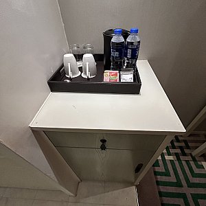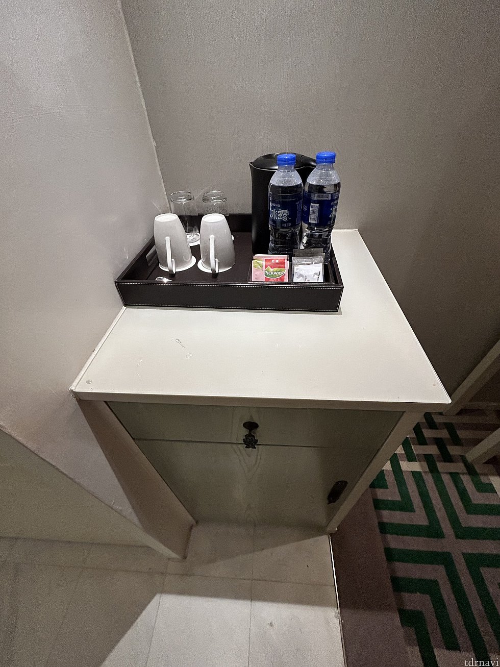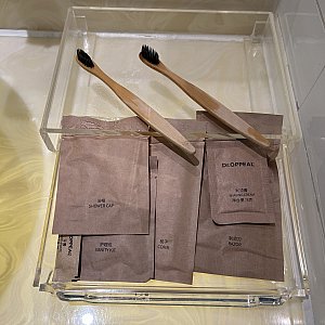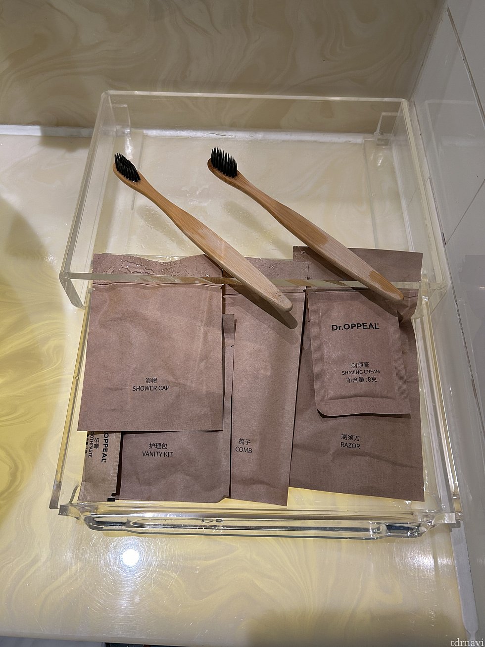 海外の基本的なアメニティはちゃんとありました。(ドライヤー・ポットなど)歯ブラシはHISのホテル案内にはなしとあったので持っていきましたが、木製の歯ブラシがありました。パジャマはありません。個人的には、紙スリッパがあったのがとても嬉しかったです。また、500mlの水も毎日補充されました。