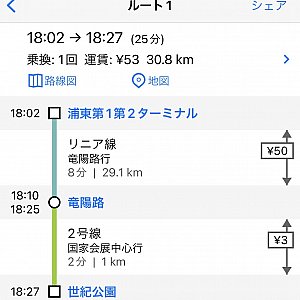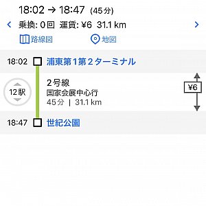 『浦東空港』から地下鉄2号線で乗り換えなく『世紀公園』まで行く事ができますが、時間短縮とリニア(マグレブ)に乗ってみたかったため、リニア+地下鉄2号線を使いました。リニアから地下鉄2号線の乗り換えは道に方向が書いてあったので、分かりやすかったです。*下図の乗り換えは現地とは漢字が少し異なります。