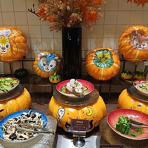 シーズンイベントに合わせたコスチュームを纏っています。レストラン内をぐるっと回ってくれますが、細い通路には入って来ないので、外周の通路側のお席の方がよりキャラと触れ合える可能性は高いです。