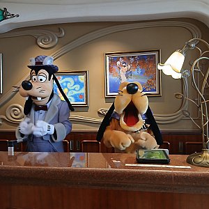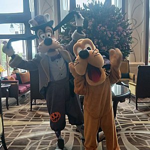 レストランを出ると、ロビーでグーフィー&プルートのグリーティング列ができていました。レストラン内での行進時の衣装です。