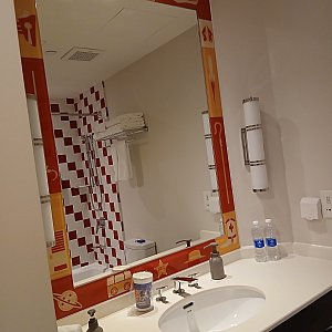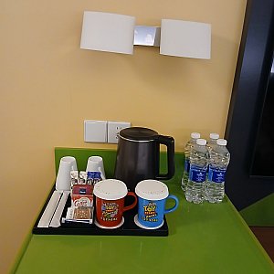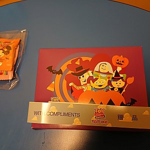 歯ブラシやクシ等の身の回り品の他に、ティーバック、お水のペットボトル1人3本(使った分は補充して下さった!)と、トイ・ストーリーの記念品が置いてありました。エコバック、シール、バッチ(厚紙?素材で作ってある簡単なもの)、紙コップなど…
